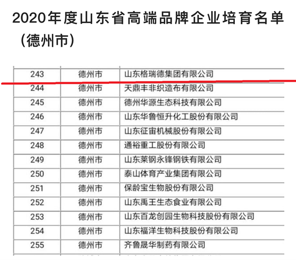 通过自愿申报、地市推荐、材料初审、信用核查、专家评审等工作程序,按照重点培育、动态管理、争创国际知名品牌的要求,经过对山东省16市局推荐上报的883家制造业、228家服务业的材料初审、专家评审及定量指标评价,山东格瑞德集团有限公司最终顺利通过专家组审核,充分展现了公司日益强劲的品牌影响力。