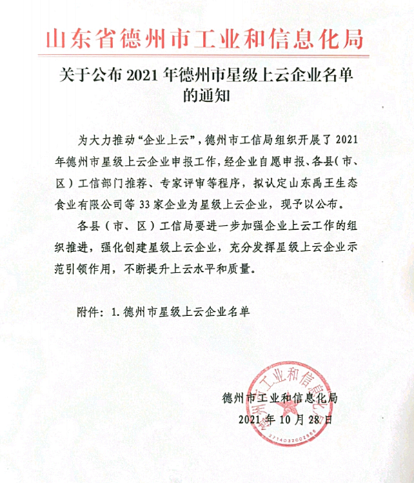 格瑞德集团自2018年起,开展企业上云工作,积极响应省企业上云的号召,结合集团实际需求,购置云服务器等设备,将商务运营平台及手机端迁移到云端,实现德州市第一家企业上云,充分利用上云的优势,提高了服务器的访问速度及服务器处理能力,并获得“山东省企业上云标杆企业”等荣誉。