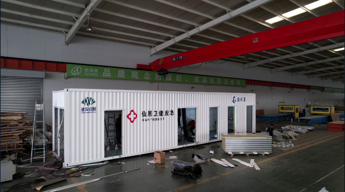2022年初,格瑞德集团接到一批特殊的订单,10个方舱实验室,临近年关,时间紧任务重,集团积极协调调度,加班加点赶生产,最终在正月28凌晨,将前期所需的4个方舱实验室发至浙江、北京、河北等地,主要采用集团净化钢质门、净化彩钢板等产品,并负责整体的安装工作。