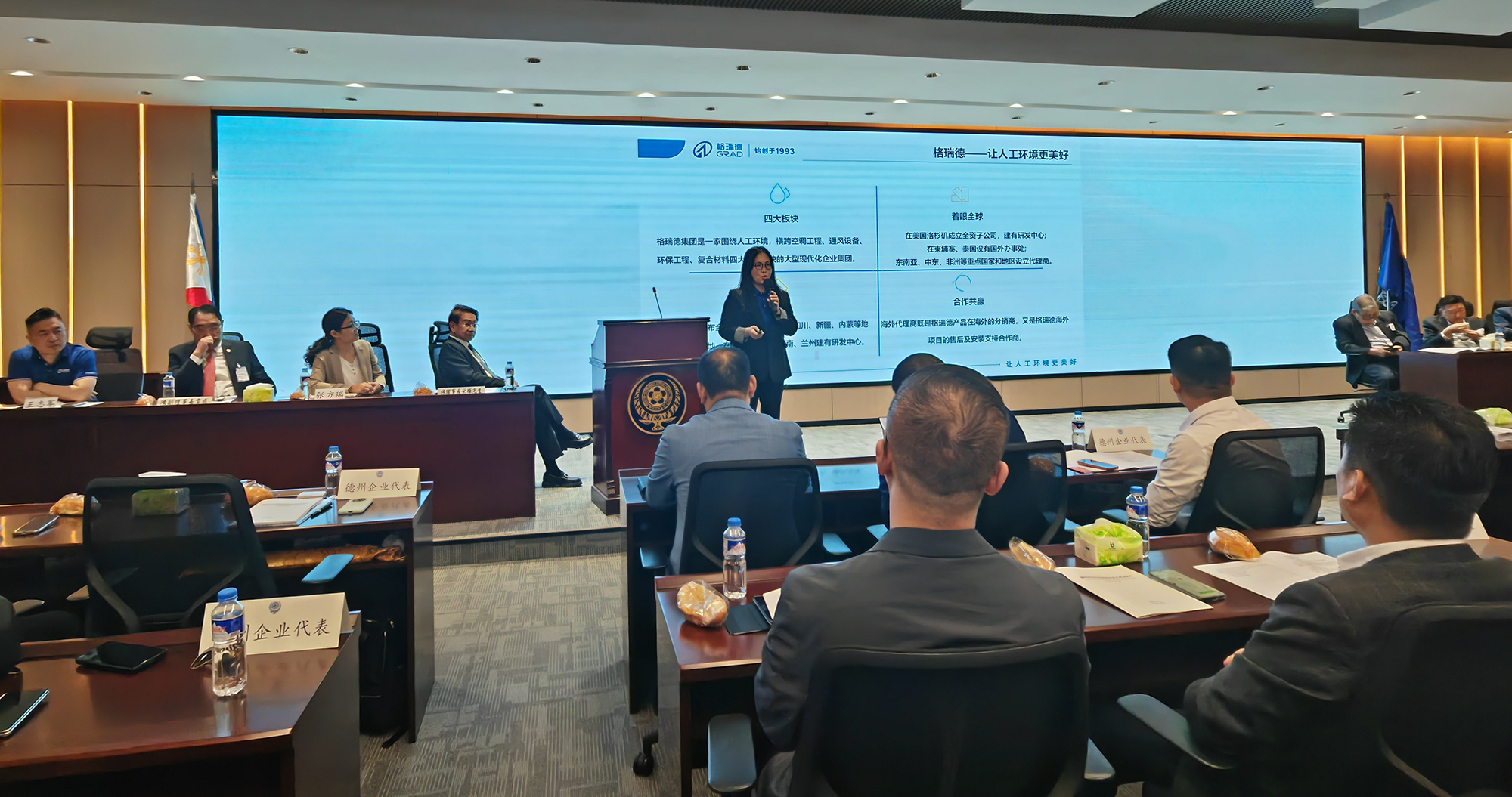 山东格瑞德国际贸易工程公司总经理扈淑君代表集团发言,介绍格瑞德核心业务、海外布局及在东南亚市场的发展规划,表达与菲律宾各界深化合作、携手共赢的愿景。
