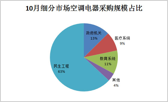 继7月、8月和9月空调电器保持向好势头外,10月采购规模再破十亿元大关。较上月相比,各细分市场采购规模均有所下降。其中,清洁取暖仍然势头不减,采购规模达10.1亿元,占比逾六成;政府机关采购规模2.04亿元,位居第二;教育系统、医疗系统等细分市场采购规模均在1亿元以上。