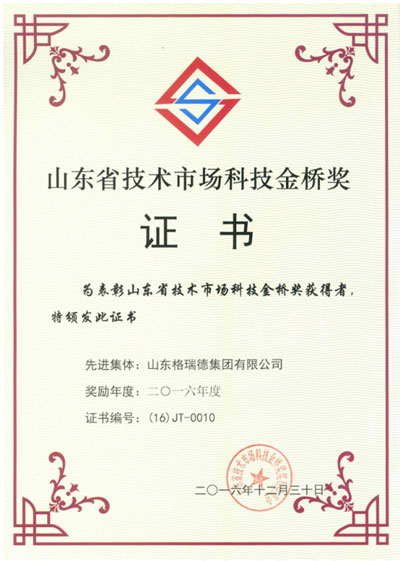 为认真贯彻落实省委省政府决策部署,全面深化科技体制改革、深入实施创新驱动发展战略,充分发挥科技金桥奖桥梁纽带作用,表彰在全省技术市场工作中做出突出贡献的集体、个人和优秀科技成果转化项目,近日,依据《山东省技术市场科技金桥奖奖励办法》并经专业组评审、评审委员会评审、奖励委员会评审,山东省技术市场科技金桥奖奖励委员会发布了《关于2016年度山东省技术市场科技金桥奖奖励的决定》,山东格瑞德集团有限公司获得山东省技术市场科技金桥奖先进集体奖;集团降膜式冷水机组荣获山东省技术市场科技金桥奖优秀项目二等奖。